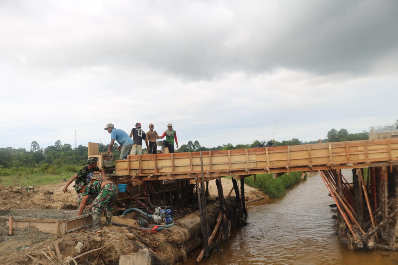 Selaku Dansatgas,Dandim 0907/Trk Letkol Inf Eko Antoni Chandra Lestianto Mengatakan,Beberapa hari kemarin cuaca kurang memungkinkan. Tetapi siang ini sudah ada panas sedikit, dan mengerahkan tenaga secara gotong-royong dengan alat seadanya untuk melakukan tahapan Penyelesaian pengecoran Tiang Pondasi jembatan,ucapnya.