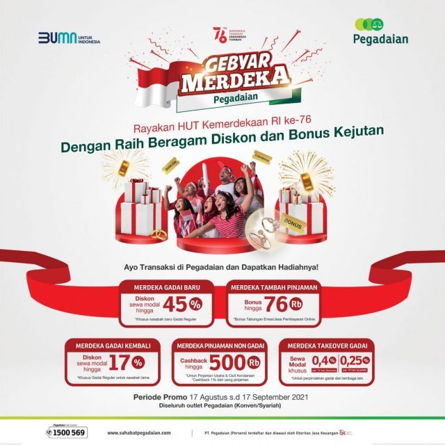 Balikpapan, Borneoupdate.com – Dalam rangka merayakan dan memeriahkan HUT ke-76 Republik Indonesia, PT Pegadaian (Persero) memberikan apresiasi kepada masyarakat Indonesia dengan menyelenggarakan Program Gebyar Merdeka tahun 2021. Para konsumen bisa menikmati pengembalian tunai (cashback) sebesar 17 persen hingga 45 persen setiap kali bertransaksi di seluruh outlet Pegadaian. Program ini berlaku selama satu bulan sejak 17 Agustus hingga 17 September 2021.