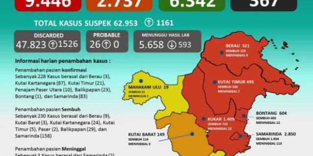 Dari 228 kasus positif baru itu sebanyak 83 kasus dari Kota Samarinda, 87 kasus dari Kabupaten Kutai Kertanegara, 21 kasus dari Kabupaten Kutai Timur, 23 kasus dari Kota Balikpapan, 10 kasus dari Kabupaten Penajam Paser Utara, 3 kasus dari Kabupaten Berau dan 1 kasus dari Kota Bontang.
