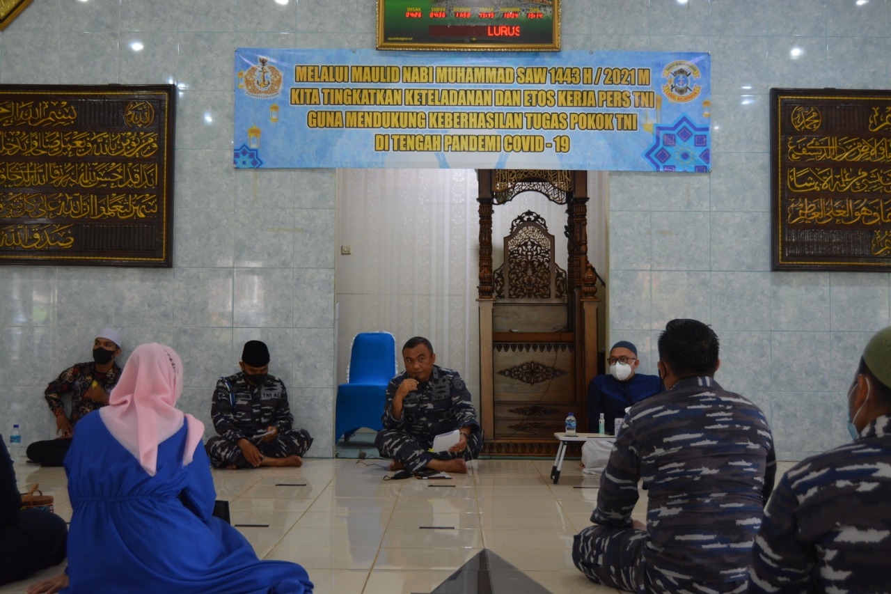 Balikpapan, Borneoupdate.com – Bertempat di Markas Komando Pangkalan TNI AL Balikpapan jalan Yos Sudarso No 14 Kota Balikpapan, Komandan Pangkalan TNI AL Balikpapan Kolonel Laut (P) Siswo Widodo, S.T., Balikpapan menggelar acara peringatan Maulid Nabi Muhammad SAW 1443 H tahun 2021 dengan tema “Melalui Maulid Nabi Muhammad SAW 1443 H tahun 2021 kita tingkatkan keteladanan dan etos kerja personel TNI guna mendukung keberhasilan dalam tugas pokok TNI ditengah pandemi Covid-19” penceramah dalam kegiatan ini adalah Ustadz Agus Khoirul Huda, Lc. bertempat di Masjid AL Bahari, Mako Lanal Balikpapan Pada Kamis (21/10/2021).