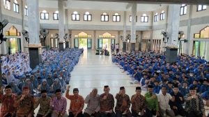 Usai ramah tamah, Prof. Mu’ti menuju masjid al Mujahidin untuk bertemu para santri. Langkah kaki saya turut mengawal beliau. Kali ini hanya santri kelas 7,8, 10 dan 11 yang ada. Karena santri di kelas 9 dan 12 sudah menyelesaikan ujian sekolah dan kembali ke rumah masing-masing. Memasuki teras masjid terlihat ratusan santri sudah berada di dalam. Mereka duduk berbaris rapi dalam kelompok putra dan putri.