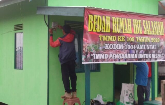 Amuntai, Borneoupdate.com – Memasuki Hari ke 26 Perehapan Rumah Tidak Layak Huni (RTLH) kepada para penerima bantuan yang menjadi sasaran Fisik pada program TNI Manunggal Membangun Desa ke-109 Kodim 1001/Amuntai, sudah hampir rampung sudah memasuki tahap pemasangan KWH listrik dirumah Ibu Marna dan Ibu Salasiah di Desa Sarang Burung, Kecamatan Danau Panggang, Rabu (14/10/2020).