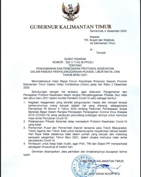 Gubernur yang juga merangkap sebagai Ketua Satuan Tugas Penanganan Covid-19 menerbitkan Surat Edaran Nomor 300.1/7143 /B.PPOD.I tertanggal 2 Desember 2020 ditujukan kepada seluruh bupati dan wali kota di 10 kabupaten dan kota di Kaltim.