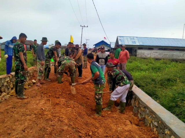 Dan SSK Kapten Inf Mahmud Dalli Menjelaskan “Untuk pengerjaan sasaran fisik pengecoran siring jalan sudah selesai akan tetapi untuk finishing pengerjaan penimbunan tanah di kanan dan kiri jalan masih terus dikerjakan” Jelasnya