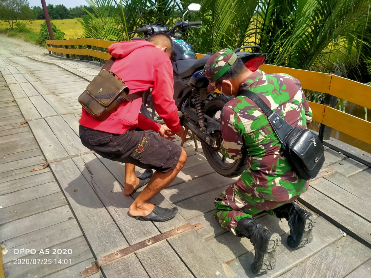 Sebagai wujud bentuk kedekatan dengan warga, salah satu aparat Desa Sungai Telan Besar pada saat melintasi jalan kebetulan sepeda motor mengalami ganguan dan mesinnya mati, dengan sigap anggota Satgas TMMD 108 membantu.