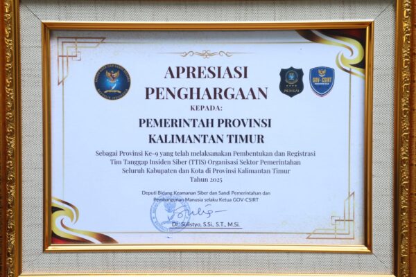 Samarinda, Borneoupdate.com – Komitmen Kalimantan Timur dalam memperkuat keamanan siber kembali mendapat pengakuan nasional. Pemerintah Provinsi Kaltim menerima Piagam Apresiasi Penghargaan dari Badan Siber dan Sandi Negara (BSSN) setelah dinilai berhasil menyelesaikan pembentukan dan registrasi Tim Tanggap Insiden Siber (TTIS) di seluruh kabupaten dan kota pada 2025.