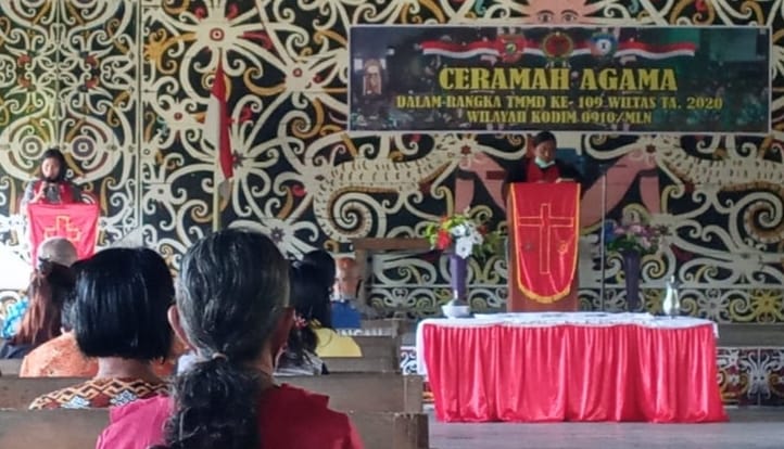 Seperti pada saat di hari Minggu (18/10/2020) anggota Satgas TMMD yang Nasrani membaur bersama warga desa di Balai Adat Amin Biyo Lawai Lerang, Desa Long Loreh, Kecamatan Malinau Selatan, Malinau, Kalimantan Utara untuk mengikuti kebaktian yang dipimpin Pendeta John Asihua Lidim, walaupun Gereja GKPI tempat semestinya untuk beribadah belum bisa dipergunakan karena masih dalam tahap pembangunan, tidak menyurutkan niat beribadah para anggota Satgas TMMD dan warga.